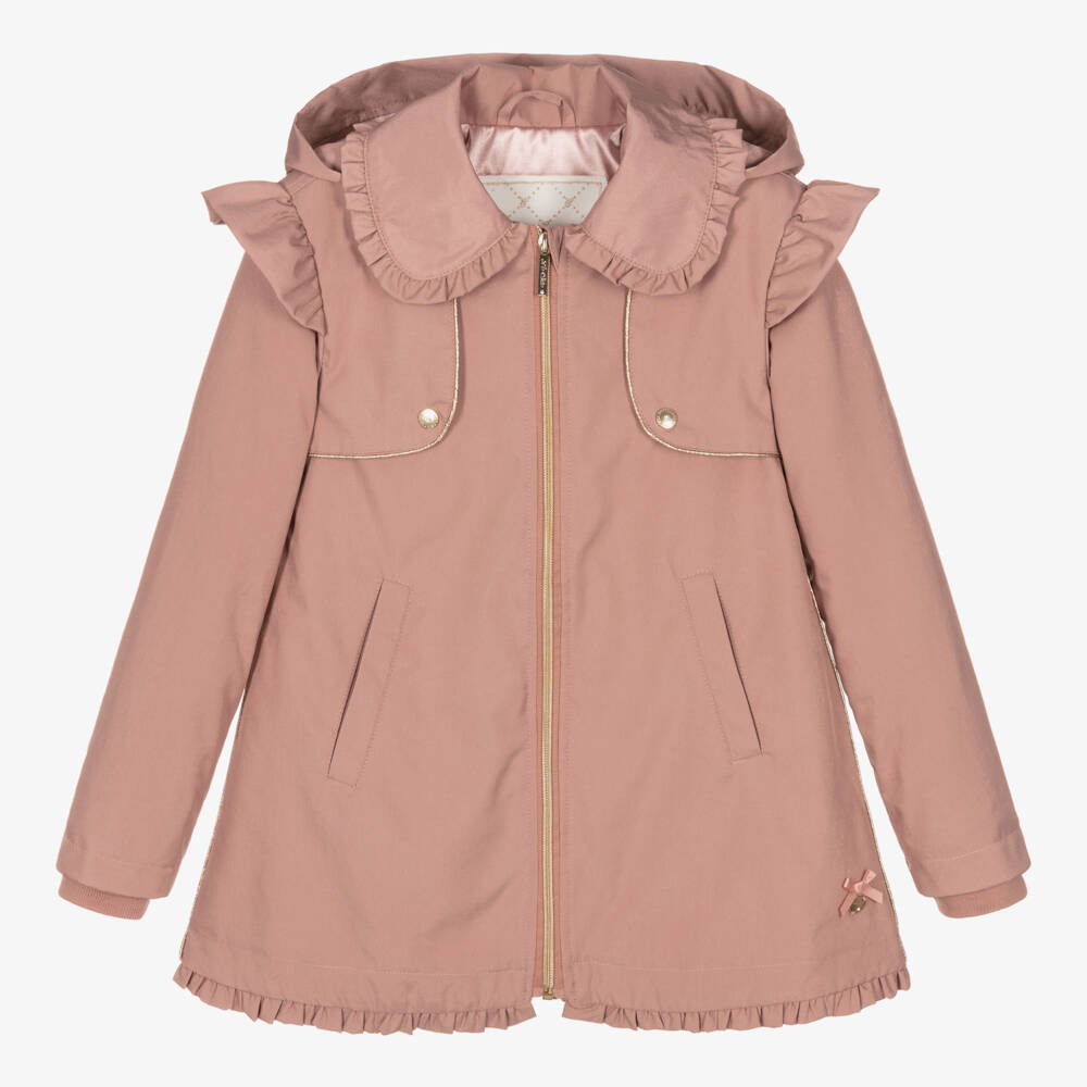 Dusky pink coat for girls by Le Chic, made in silky lightweight twill with a subtle shimmer. It has pretty frills on the collar, shoulders, and hem for a pretty look. There are two gold popper fastening gun flaps on the front and a heart logo charm above the hem. It fastens with a gold logo zip and is lined with shiny pink satin.