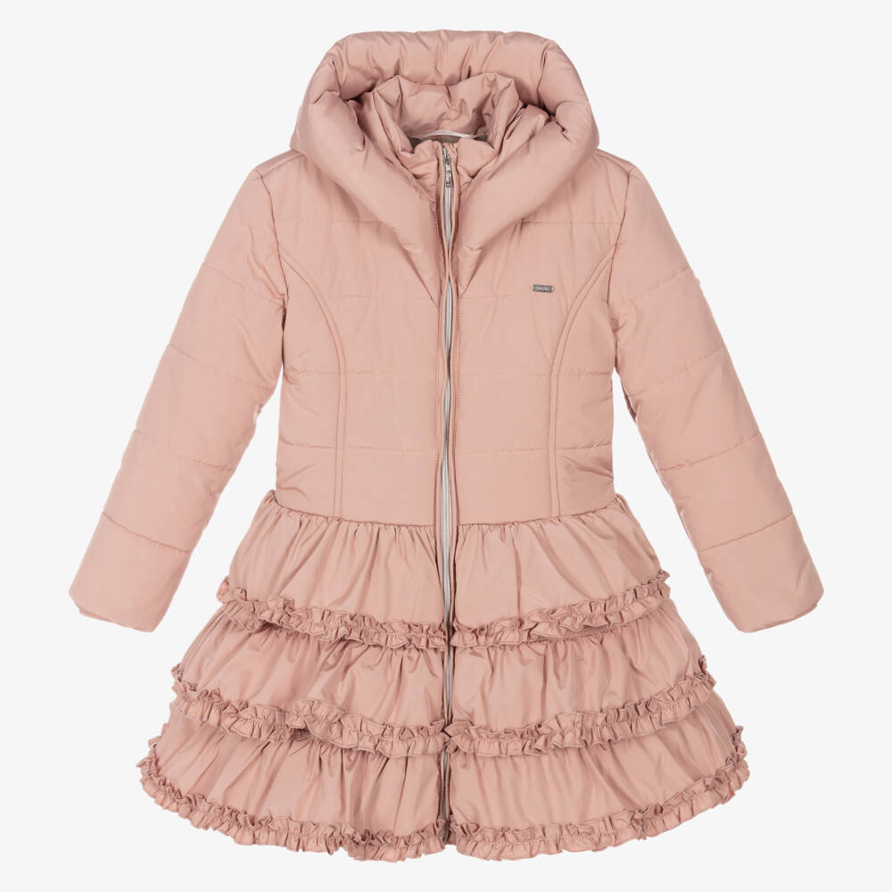 Girls pink hooded puffer coat from Le Chic, with lovely tiered ruffles. In a beautiful fit and flare shape with logo details on the chest and sleeve, this warmly padded coat is made in smooth recycled polyester. It has a grey plush fleece half lining and front zip fastening. The cuffs have inner ribbing and there are concealed side pockets with an internal zipped pocket.