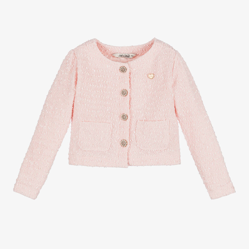 Smart pink jacket for girls by Le Chic, ideal for a special occasion. Patterned with wavy, fringed lines of shiny thread and scattered sequins that catch the light beautifully, it fastens with stylish pearl bead and diamanté buttons. There are useful patch pockets on the front.