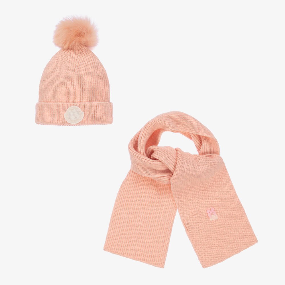 Pale pink hat and scarf set for girls by Le Chic, with glittery thread in the weave. Made in a soft and cosy ribbed knit, this lovely set is both warm and stylish on cold, chilly days. The hat has a pink, faux fur pom-pom on top and a pearl bead logo badge appliquéd on the turned-up brim. The scarf has a sweet pink satin bow appliqué with a pearl and a logo tab below.