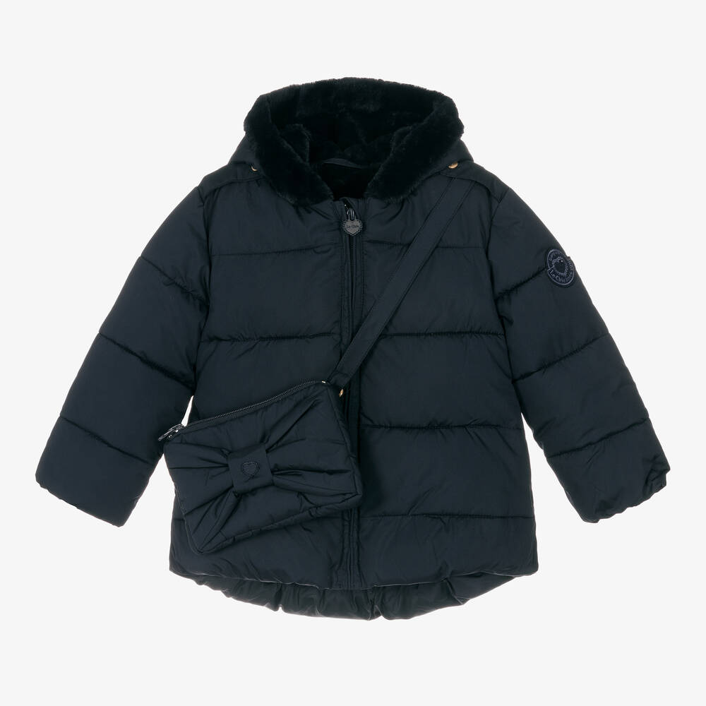 Navy blue hooded puffer coat and bag for girls by Dutch brand Le Chic, made in soft, silky satin with a sheen. The hood has a bow on top and a navy blue, faux fur trim, matching the lining. The epaulettes have golden popper fastenings sparkling with diamantés. There is a navy blue logo badge on one sleeve and a gold, heart-shaped pull tab on the front zip fastening. It comes with a matching crossbody bag that has a bow on the front and a navy blue logo heart charm. It fastens with a zip and has an adjustable shoulder strap.