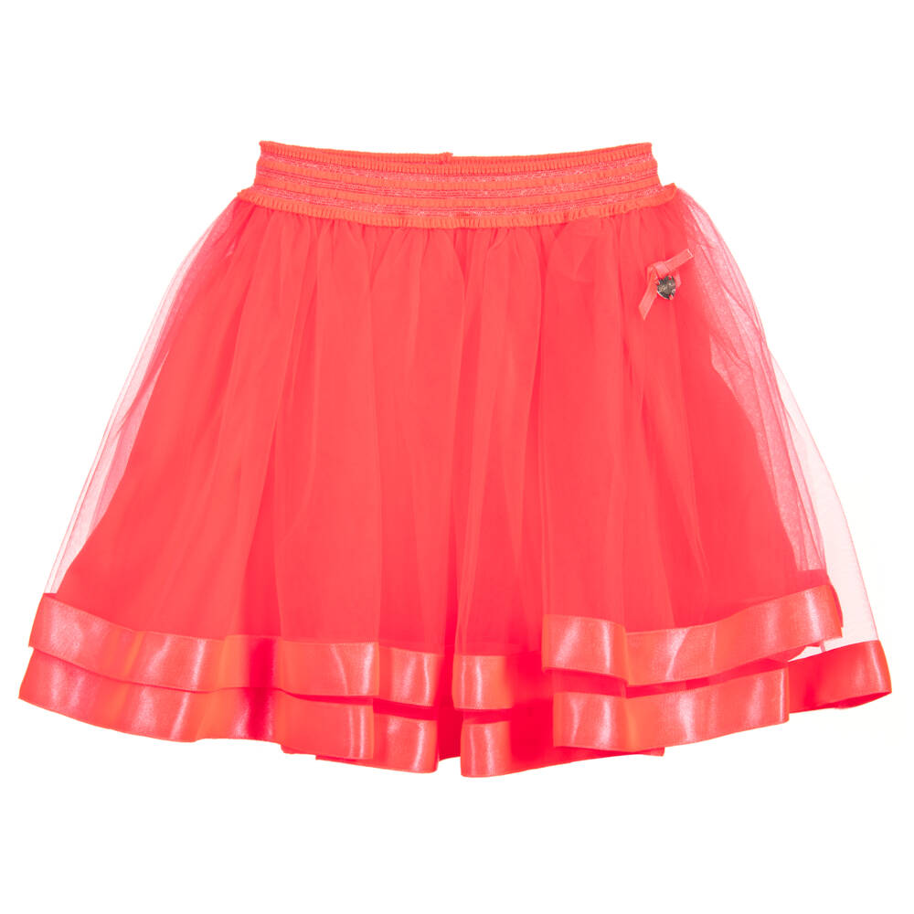 Girls neon coral pink tutu skirt by Le Chic, made in layers of soft tulle. It has satin ribbon around the hem and a comfortable jersey lining. There is a bow and gold logo charm near the elasticated waistband.