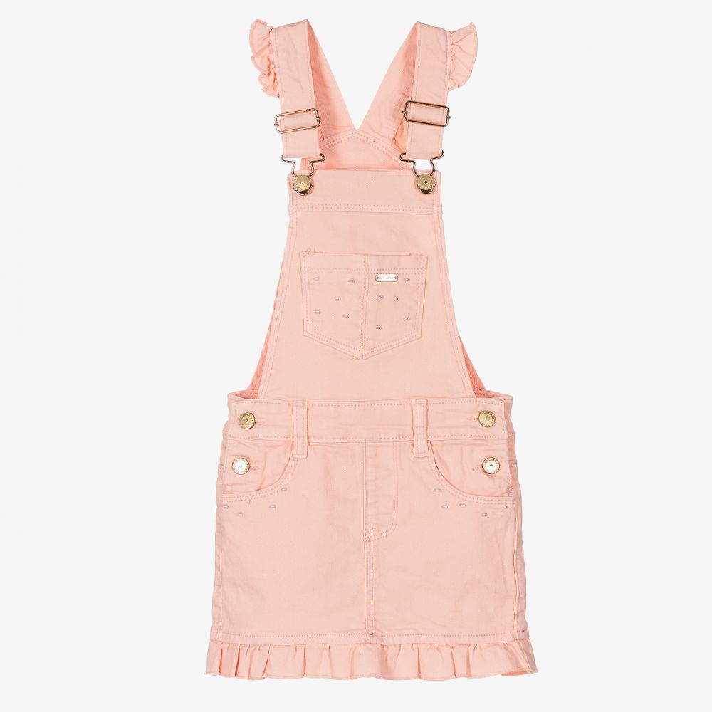 Grils pink dungaree dress byLe Chic, made in soft, stretch denim. It has a classic, bib and adjustable braces styling with gold clips. It is trimmed with pearl beading and a gold logo plate on the front pocket. There is a ruffled hem and it fastens with buttons on the side.