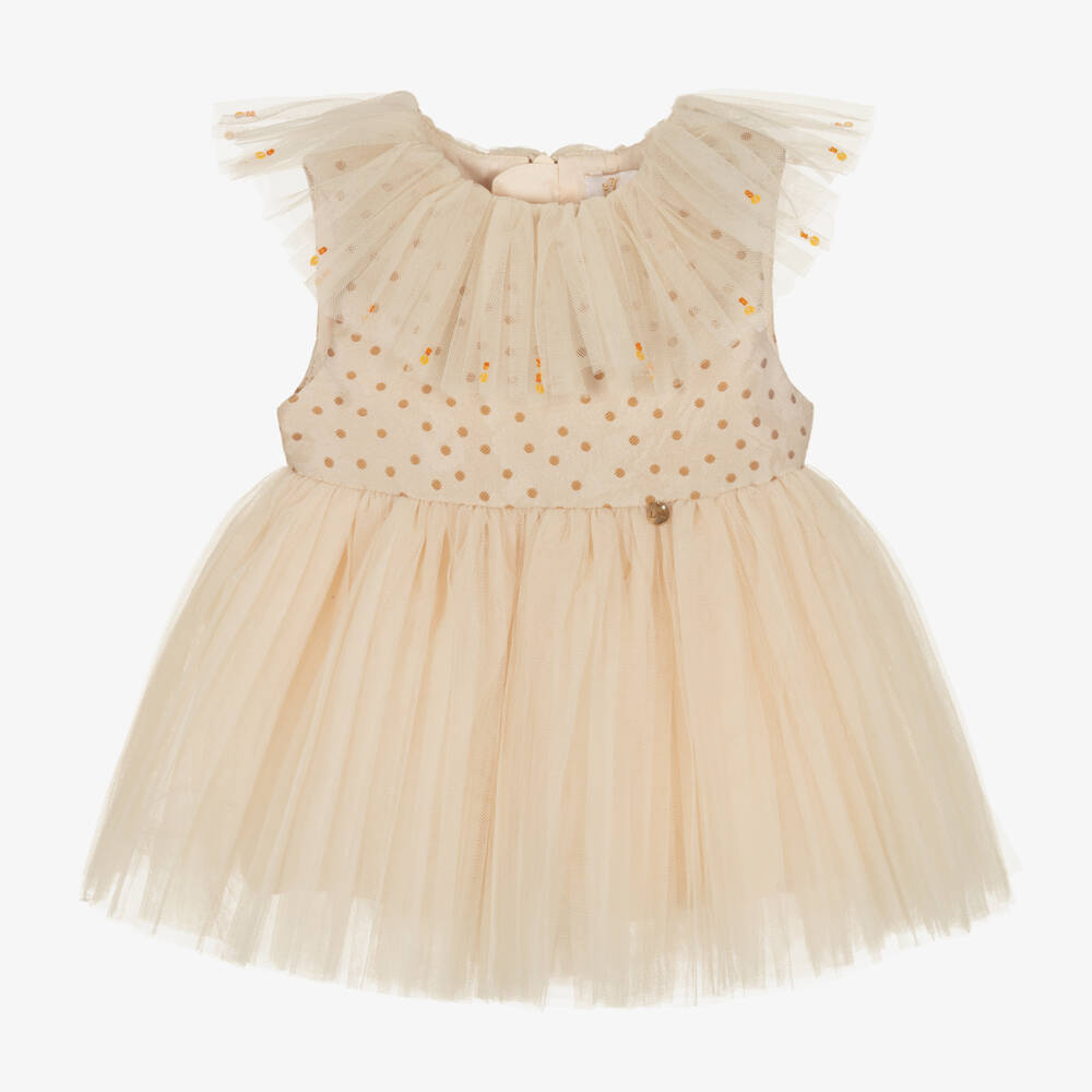 Pretty beige special occasion dress for younger girls by British brand Le Mu. It has a soft jacquard bodice patterned with dark beige polka dots, and a gathered tulle collar with orange bead and sequin detailing. The multi-layered, gathered tulle skirt has a sumptuous satin underlay and a golden logo charm sewn on the waist. The dress fastens with a concealed zip, is fully lined in voile for comfort and comes with coordinating satin knickers in the smaller sizes.