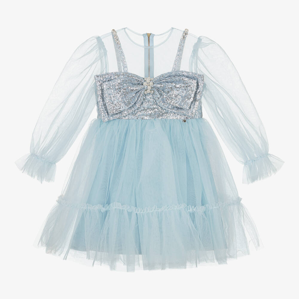 Show-stopping pale blue dress for girls from British label Le Mu. A lovely double-layered look, the bodice has a pale blue sheer tulle panel across the shoulders and long sleeves, with a stunning blue and silver brocade sweetheart-style panel and 'straps' stitched over the shoulders. Beautiful pearl, diamanté and crystal hand-applied beads are stitched on the shoulders and the stand-out decorative bow on the front for a touch of timeless elegance. Lined with smooth satin and comfortable cotton voile, the skirt is made in cascading layers of tulle. Complementing the colour palette is a statement gold zip fastening on the back.