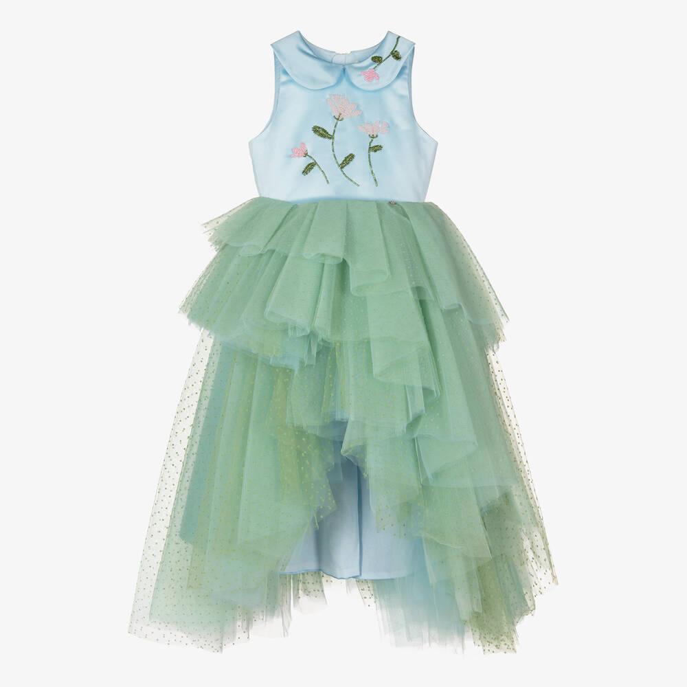 A blue and green dress for girls by British brand Le Mu, beautiful for a special occasion. The satin bodice has a Peter Pan collar hand-embellished in a shimmery floral bead pattern for an elegant look. Cascading into a high-low waterfall silhouette, the tulle skirt is finished in layers with a polka dot plumeti design. A gold-tone charm details the front and an exposed zip secures on the back. A soft cotton voile lining completes the look.