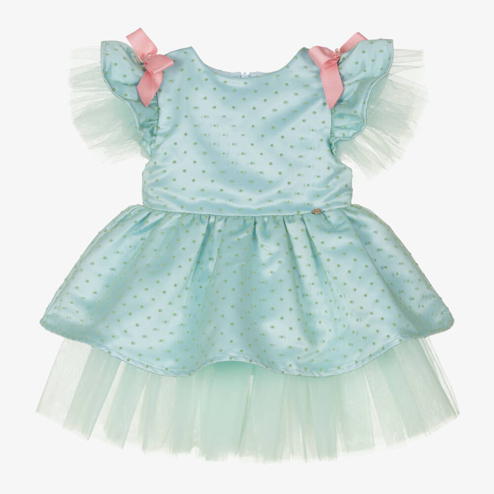 Pretty pale green special occasion dress for little girls by Le Mu, exclusive to Childrensalon. It is beautifully handcrafted from flocked polka dot tulle, set over pale blue satin for added lustre. There are soft tulle layers underneath the skirt and the capped short sleeves for a frilled, voluminous shape, with a pink accent bow on the shoulders. It is lined in lightweight cotton for comfort and fastens neatly with a seamless zip on the back. A pair of soft, gently elasticated knickers completes the look.