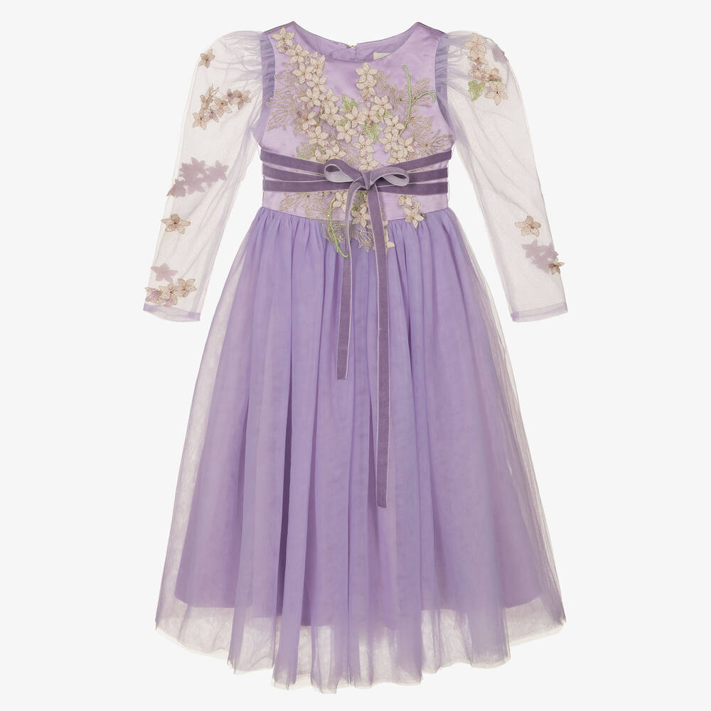 Elegant lilac-purple special occasion dress for girls by Le Mu. An Exclusive design to Childrensalon, it is made with a gold floral embroidered satin bodice and long tulle sleeves with puffed shoulders. There is a long lilac tulle skirt with tulle underskirts for volume and a removable velvet belt that accentuates the waist. Fully lined in cotton, it fastens on the back with an exposed gold-coloured zip.