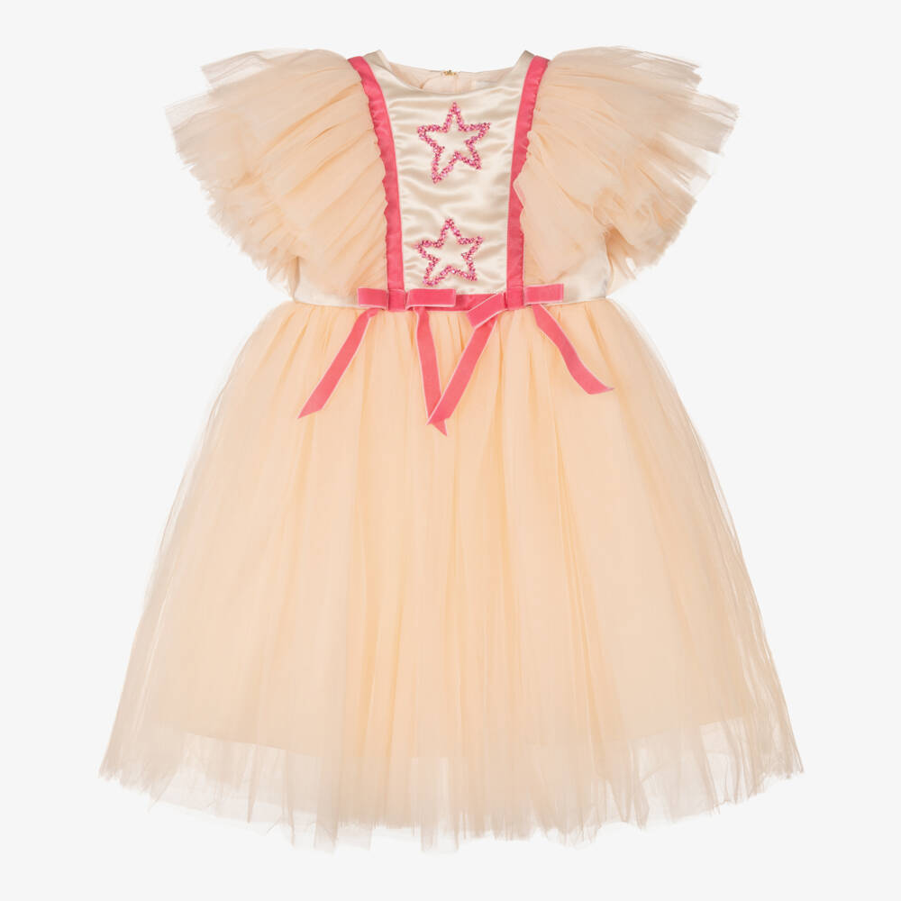 A stunning pastel orange-pink and champagne gold special occasion dress for girls by Le Mu, exclusive to Childrensalon. So pretty and feminine, the silky satin bodice is detailed with gorgeous pink hand-beaded stars, velvet decorative bows and tulle flutter sleeves. Lined with smooth satin and comfortable cotton voile, the skirt is made in cascading layers of tulle, finishing just above the ankle for a glamorous look. It fastens with a statement gold zip on the back.