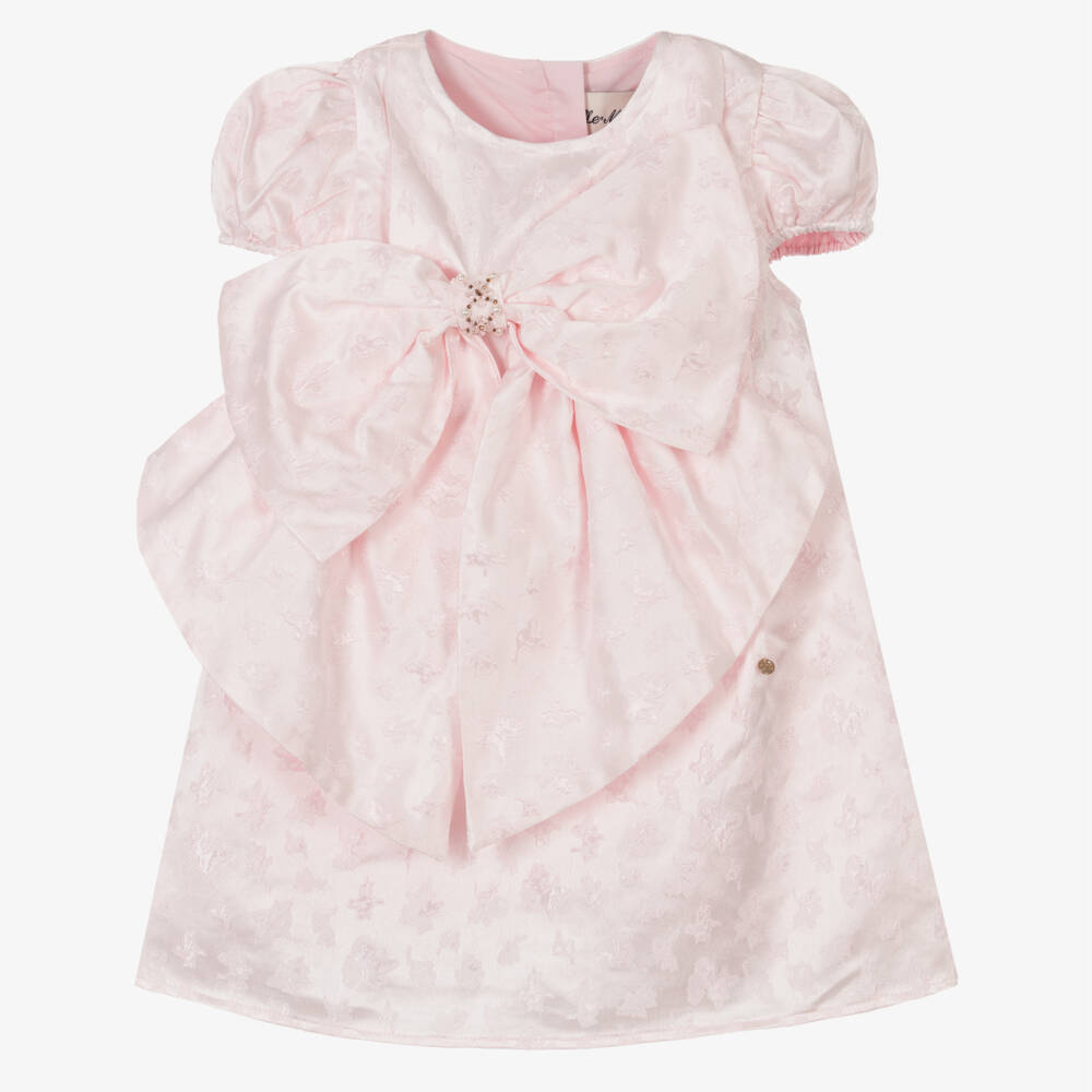 Gorgeous pale pink special occasion dress for girls by British designer Le Mu. It has a dramatic, oversized bow sewn on the front, embellished with pearl and crystal beads in the centre. The dress is made in super soft satin jacquard, with pretty puffed sleeves that have gently elasticated cuffs, and a golden logo charm sewn on one side for subtle branding. Fully lined in lightweight voile for comfort, it fastens with an exposed gold zip on the back.