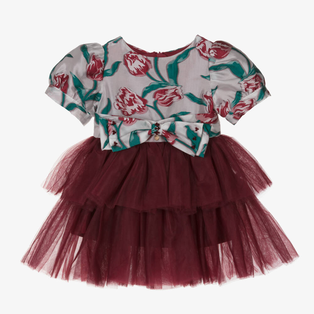 Adorable silver floral and burgundy red dress for little girls by Le Mu, ideal for any special occasion. The fitted satin bodice has a beautiful tulip jacquard design with pretty puffed sleeves and a large bow at the waist, sparkling with burgundy red gemstones and a gold logo charm. The tiered skirt is crafted in layers of soft tulle for a voluminous effect, with a lightweight cotton lining for ultimate comfort. It fastens neatly on the back with a concealed zip. Smaller sizes come with matching, gently elasticated satin knickers.