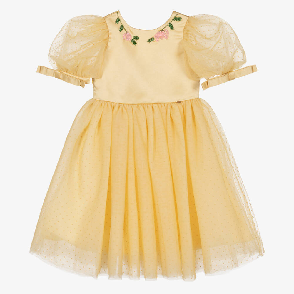 A stunning golden yellow dress for girls by British brand Le Mu, with a shimmering silky satin bodice. Lovely for a special occasion, this handcrafted piece has pretty beaded florals around the neckline in shades of pink and green. The short puff sleeves are made in polka dot tulle which coordinates beautifully with the full skirt. Lined with silky satin fabric and light cotton voile, the dress fastens on the side with a concealed zip. A gold logo charm can be seen on the waistline for a simple designer finish.