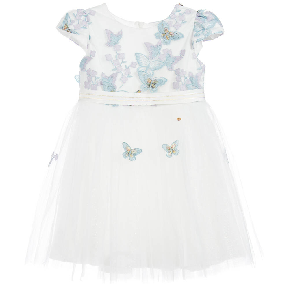 This beautiful white satin dress for girls by Le Mu has delicate overlays of tulle embellished with embroidered butterflies and flowers in blue and pink. Ideal for any special occasion, one layer of tulle is stitched with shiny iridescent thread that sparkles in the light.