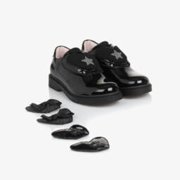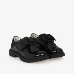 Chunky black shoes for girls by Lelli Kelly, made in patent leather with a lovely shine. Ideal for school, they are lined in soft fabric and have a supportive, cushioned insole which can be removed. The rubberised outer sole has oversized, deep ridges for a contemporary look and helps provide extra grip. They fasten with stylish black velvet laces and come with a spare pair of plain black laces for an alternative look.