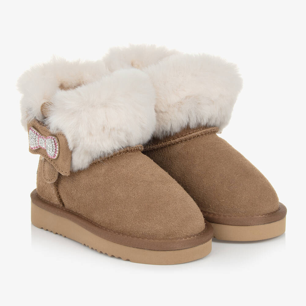 Made from smooth suede leather, these tan brown boots for girls are by Lelli Kelly. Ideal for the cooler weather, they have super soft ivory faux fur cuffs and lining. There is a pretty bow detail on the side with a pink and silver diamanté embellishment for an added touch of sparkle. Easy to pull on, they have a non-slip rubber outsole and a pale blue logo patch on the heel.