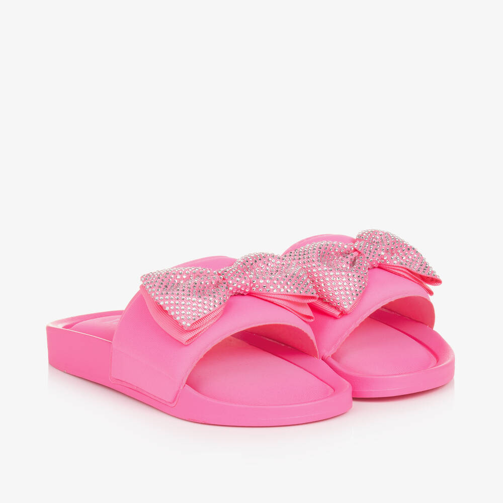 Bright pink sliders for girls by Italian brand Lelli Kelly, with a stunning diamanté bow appliqué on the front. Easy to wear, they have a gently padded textile foot strap and cushioned insole. The non-slip rubberised outer sole improves grip on slippery surfaces.