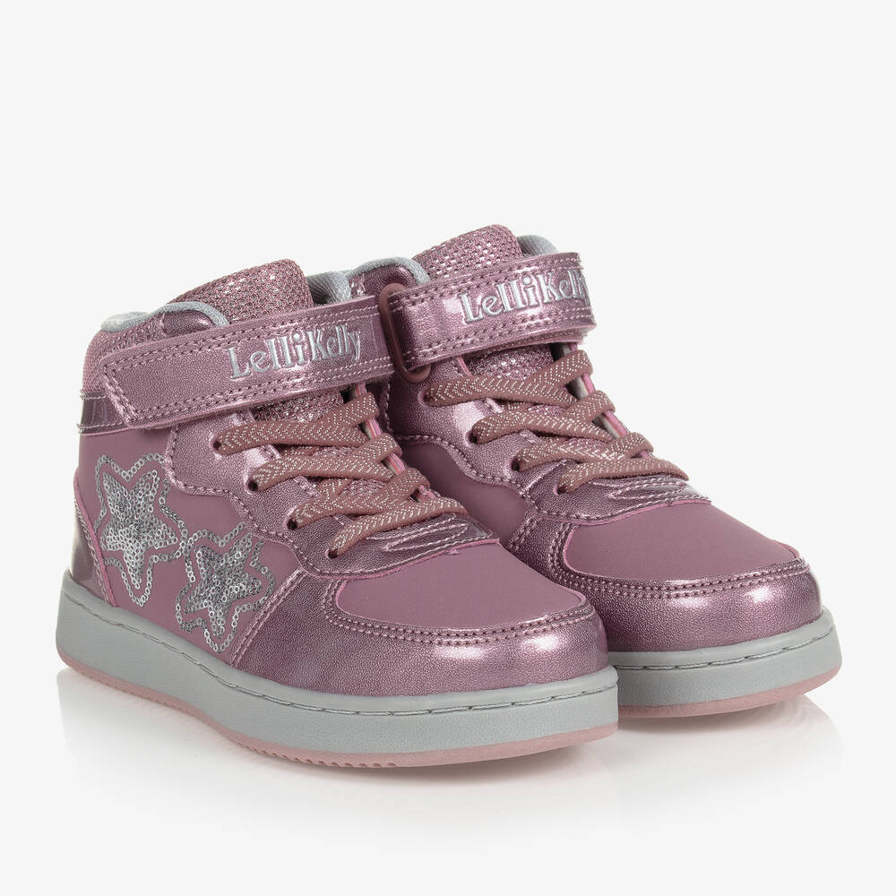 Fun lilac pink high-top trainers for girls, by Lelli Kelly. Made in soft faux leather, they have pretty silver sequin star appliqués on the sides, and shimmery elasticated laces. They easily fasten with a logo strap across the foot and have a cushioned ankle for added support. The chunky light grey outer sole provides good grip, whilst the padded insole provides all-day comfort.