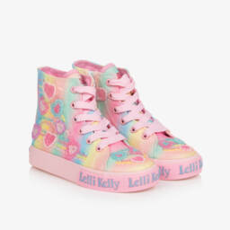 Sporty pink and purple high top trainers for girls, by Lelli Kelly. Made in soft faux leather, the uppers have girly pink sequins and stars on the sides, and pink faux laces on the front. They easily fasten with a shiny logo strap across the front, and have a pull-tab on the heel to aid with dressing. The rubberised soles guarantee good grip, and they have a cushioned textile insole for comfortable wear.