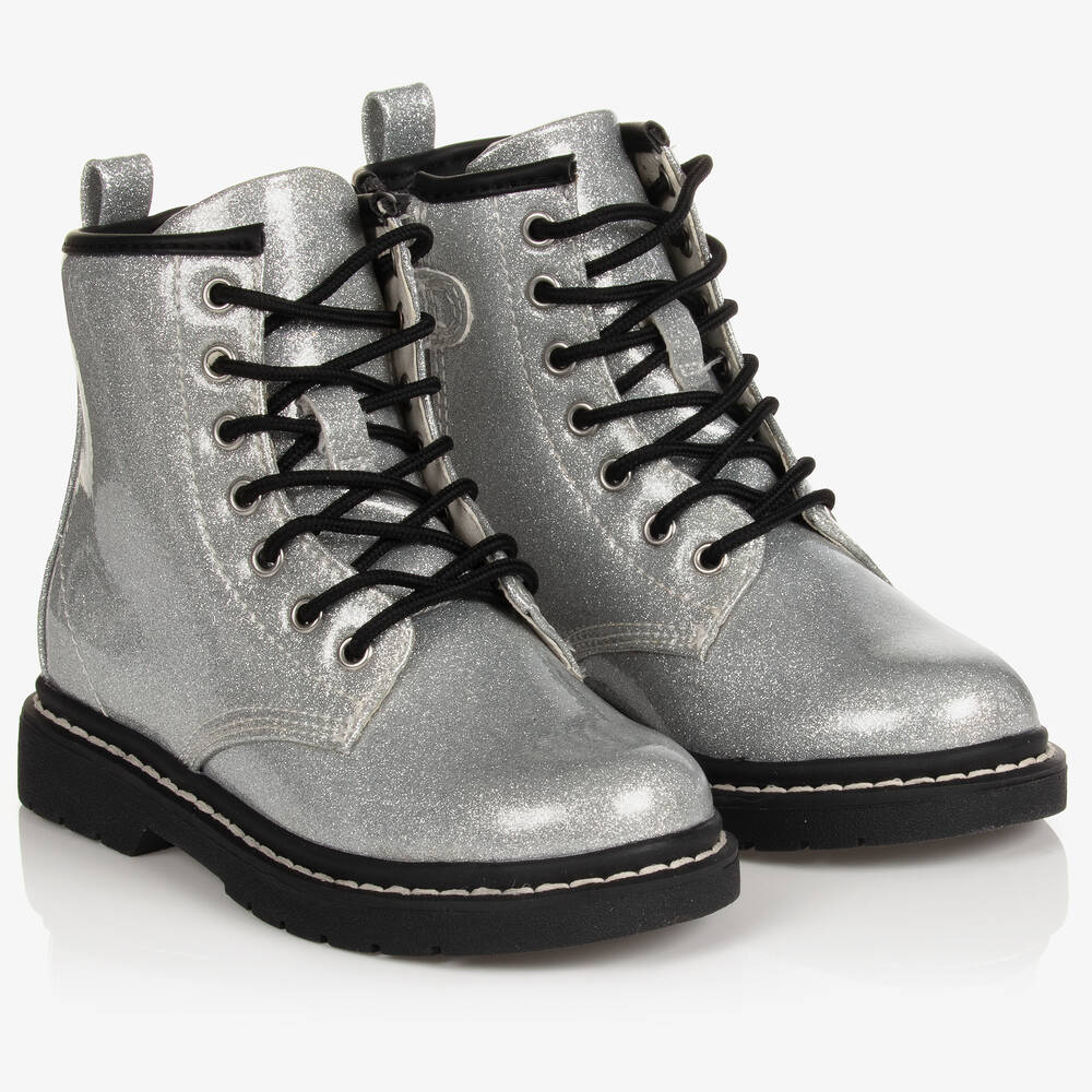 Fun and sparkly, these glittery silver ankle boots for girls are by Lelli Kelly. They are made in coated faux leather and have contrasting white stitching around the midsole. Lined in soft textile, they have a smooth leather insole and a chunky non-slip rubber sole. There are laces for fastening, with an easy side zip and velcro tab. Adding a subtle designer touch, they have tonal logo embroidery on the heel, with an embossed logo on the sole.