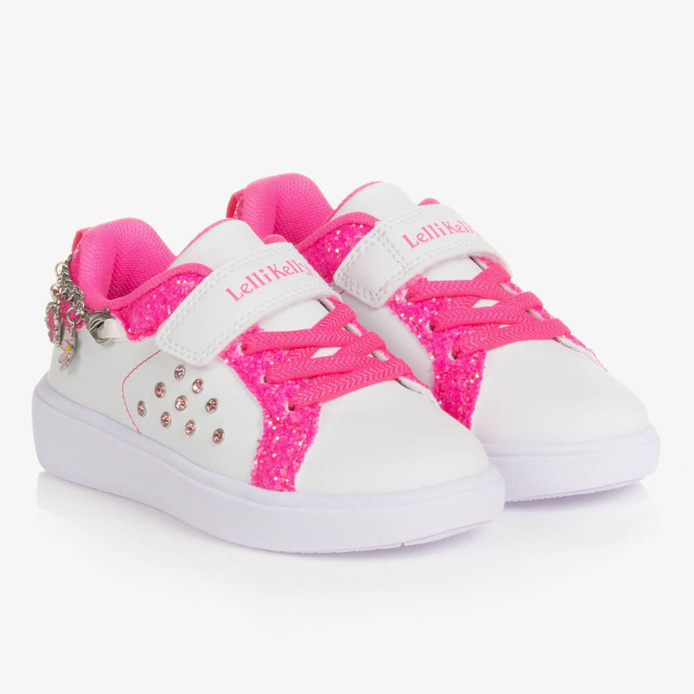 Cute white faux leather trainers for girls by Lelli Kelly, ideal for achieving a super girly look. Trimmed with sparkly glittery sequins and jewels, these adorable trainers have a neon pink logo embossed velcro strap across the foot for easy fastening. They have a super padded textile lining and insole for an ultra comfortable fit. The back of the heels have a detachable silver chain with pink daisy charms and butterflies for a glam touch.