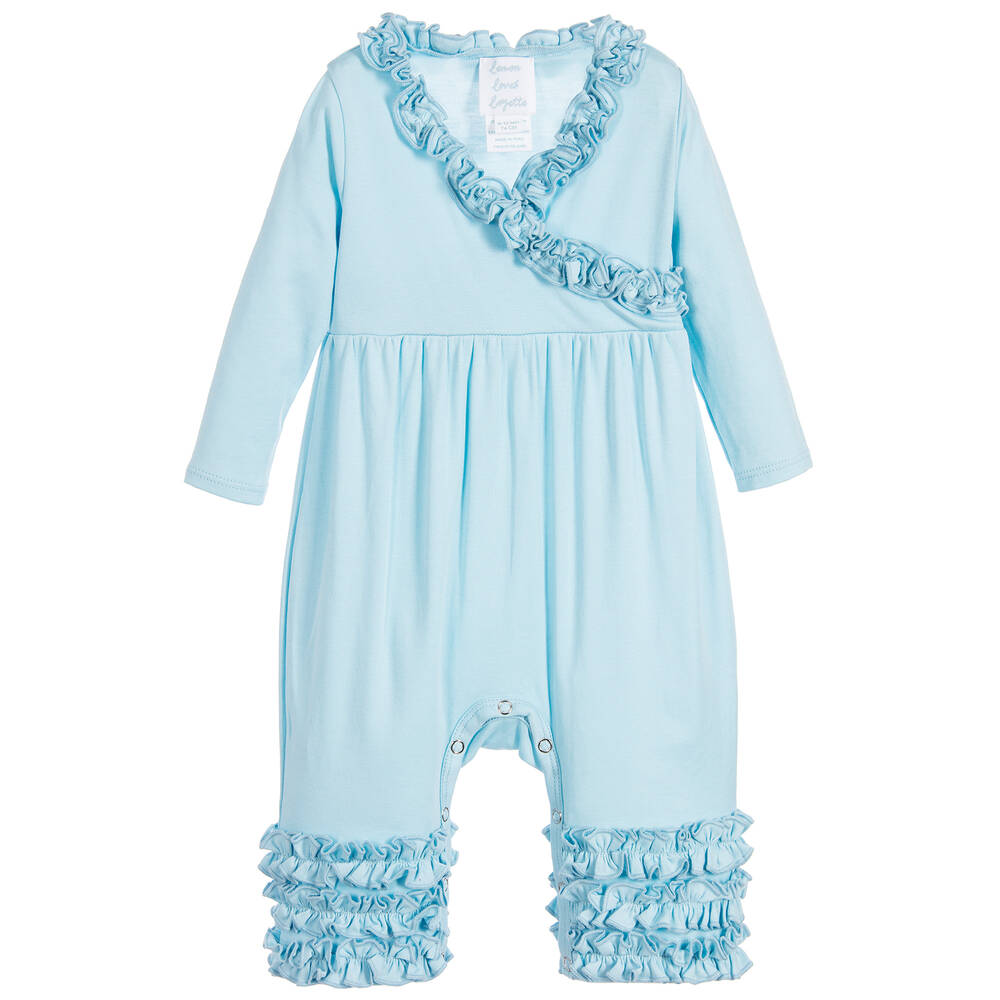 Baby girls cinderella blue ruffle 'Olivia' rompersuit by Lemon Loves Layette. Made in soft Pima cotton, this cute babysuit has a ruffled cross-over neckline and ruffles at the ankles. Without feet, there is popper fastening between the legs for easy dressing and changing.