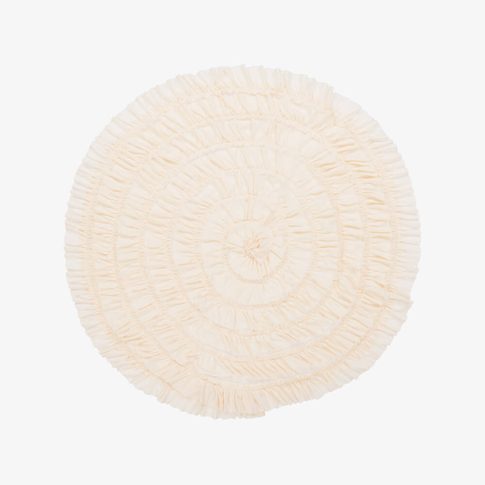 Ivory blanket for baby girls by Lemon Loves Layette, made from beautifully soft Pima cotton jersey. In a round shape, this lovely blanket is covered with gorgeous spiralling ruffles. Ideal for use when out and about as a lightweight, yet cosy cover, or in the nursery as a comfortable area to lay baby on.