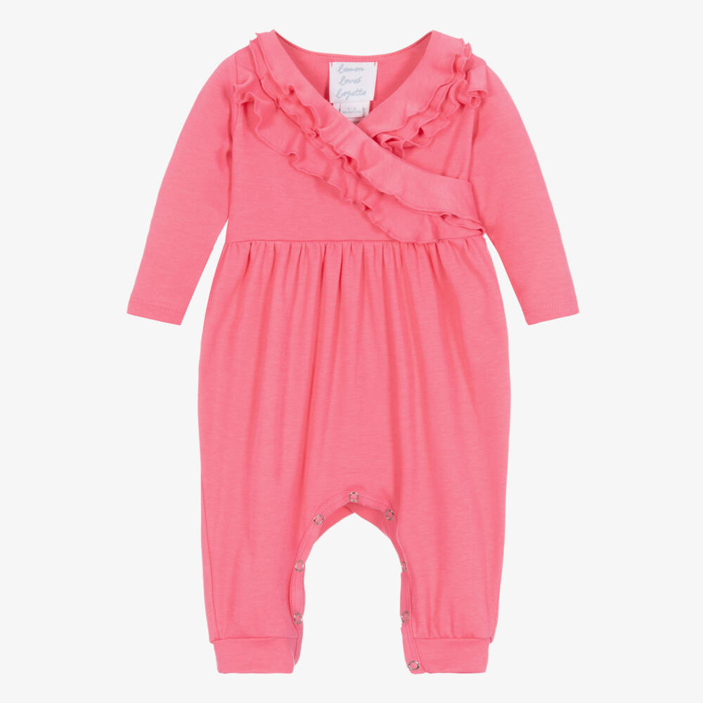 Pink romper for baby girls by Lemon Loves Layette, made in soft and lightweight Pima cotton jersey. Designed with a pretty ruffle on the cross-over bodice, it has long sleeves and popper fastenings between the legs for quick and easy dressing.