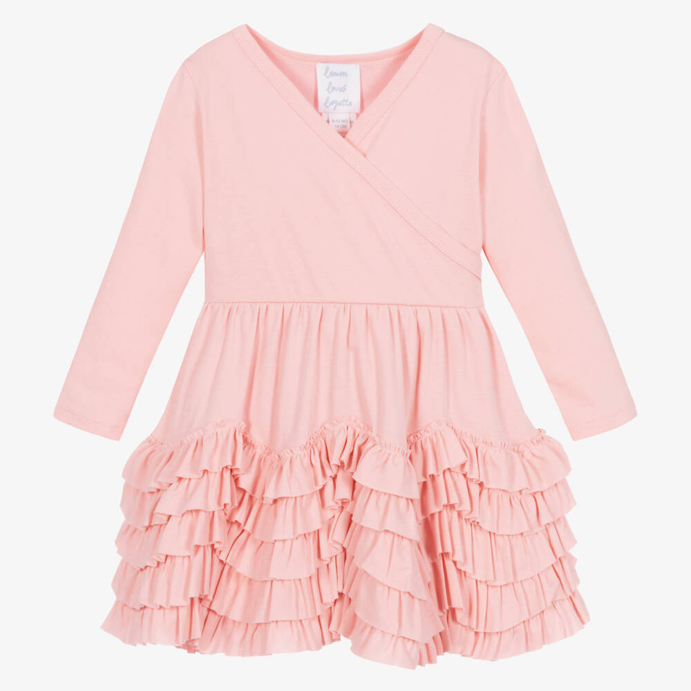 Pale pink dress for baby girls from Lemon Loves Layette, made from soft and comfortable Pima cotton jersey. Designed with long sleeves and a cross-over bodice, this sweet dress simply pulls on over the head and is finished with a beautiful ruffle hem.