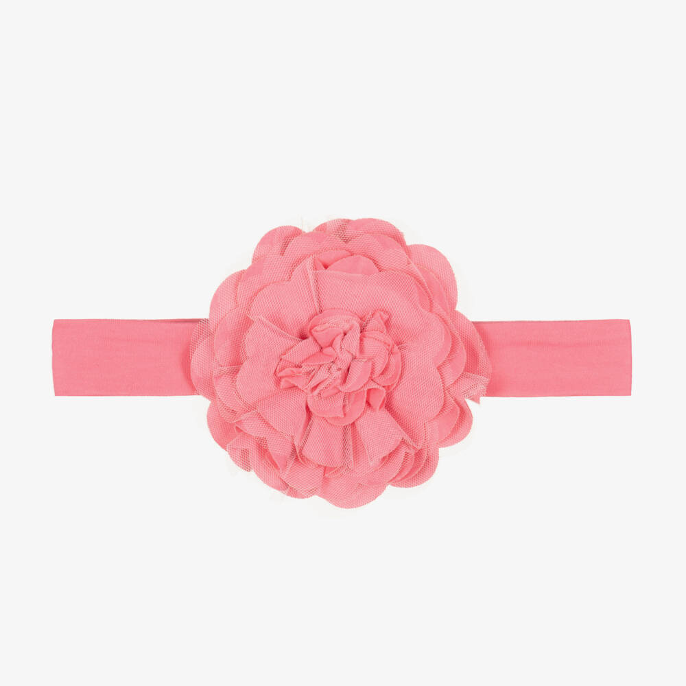 Sweet fuchsia pink headband for baby girls by Lemon Loves Layette, made in super soft Pima cotton jersey. It has a ruffled lily pad flower in the centre, with layers of tulle petals giving a pretty finish.