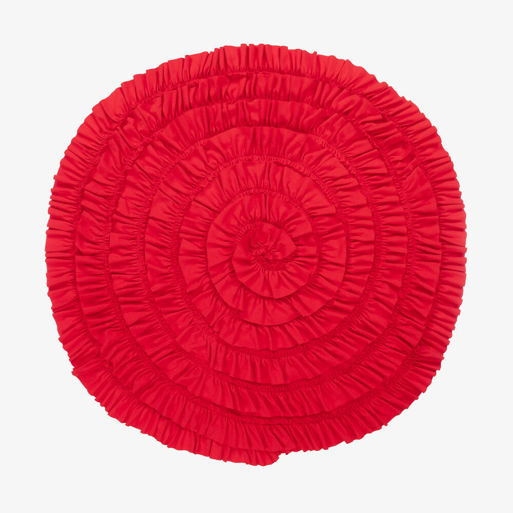 Red blanket for baby girls by Lemon Loves Layette, made from beautifully soft Pima cotton jersey. In a round shape, this lovely blanket is covered with gorgeous spiralling ruffles. Ideal for use when out and about as a lightweight, yet cosy cover, or in the nursery as a comfortable area to lay baby on.