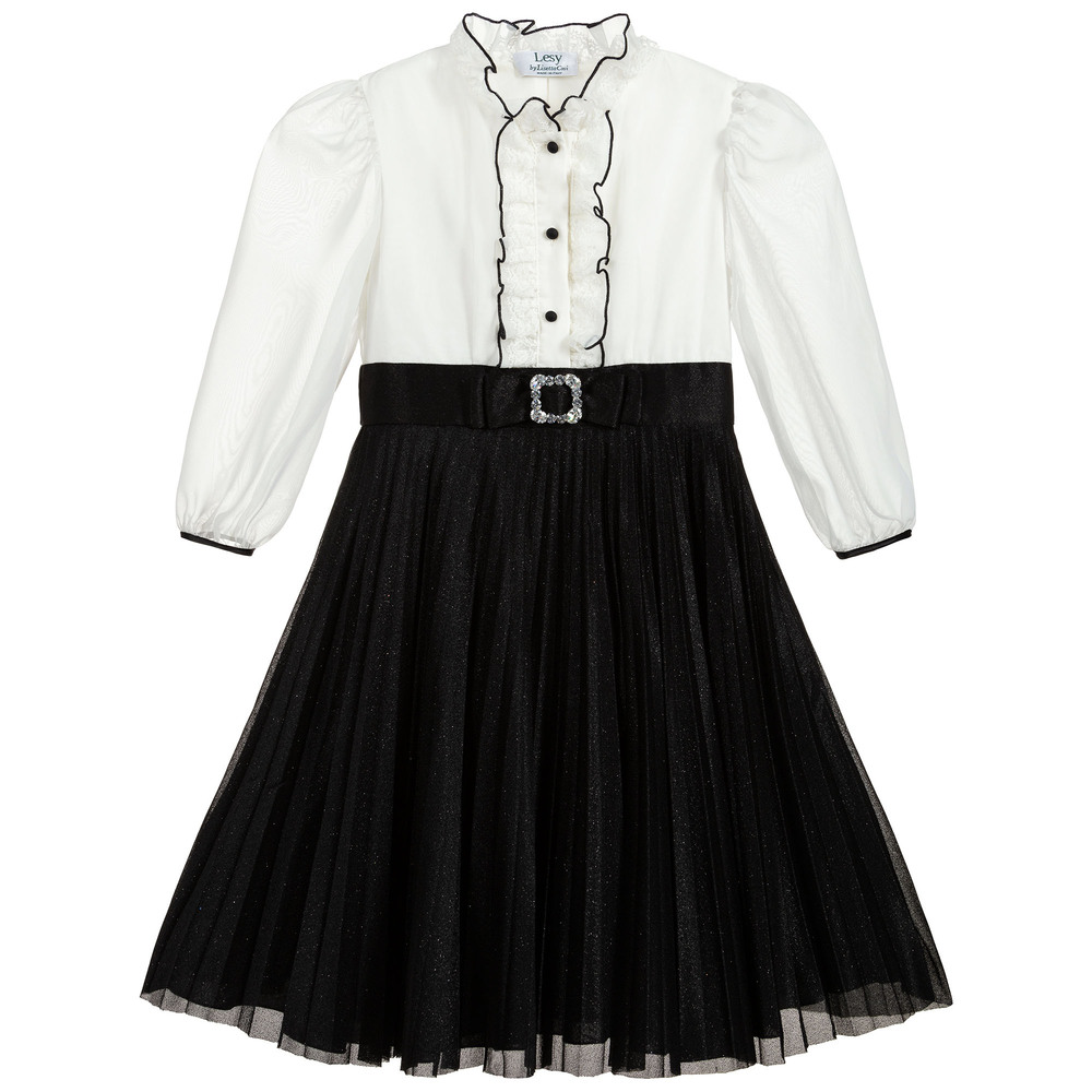Girls elegant black and white dress by luxury brand Lesy. Fully lined in soft cotton, the sheer chiffon bodice has pretty chiffon and lace ruffles around the neck and on the front. The sparkly black skirt is pleated in stretchy tulle, with a lightweight cotton lining and frills of tulle for a fuller shape. The waistband has a bow with square crystal buckle detailing.