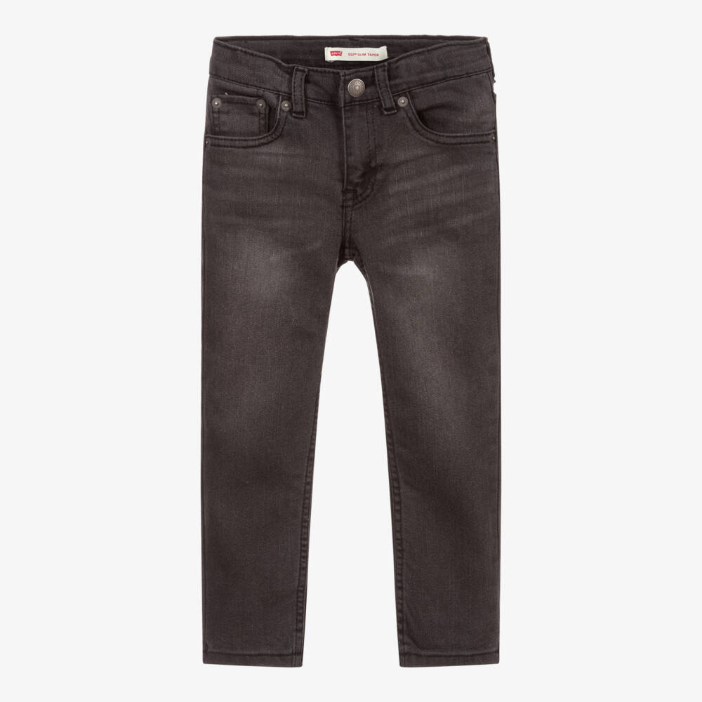 Black denim 512 jeans for boys by American brand Levi's, with a washed and worn look. Soft, lightweight and stretchy, these comfortable, slim taper fit jeans are slim through the thigh and have a tapered leg. The useful, adjustable waistband has a 2-Horse logo badge and the iconic Red Tab logo is on one of the back pockets.