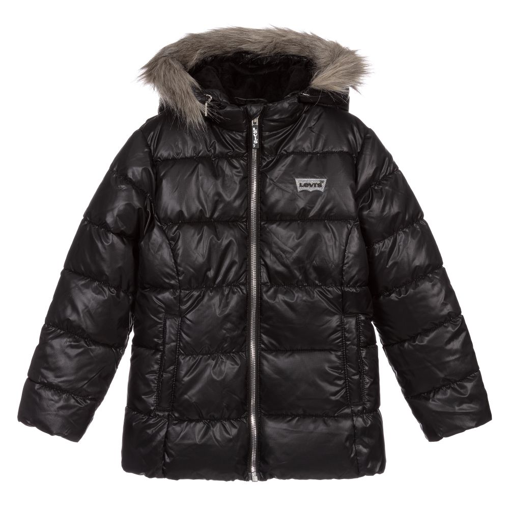 Black padded coat for girls by Levi's, with a sparkly silver Batwing logo on the chest. Water resistant and insulated, it provides warmth and protection from the elements. The coat has an exposed zip fastening, front pockets, and a detachable faux fur trim on the hood.