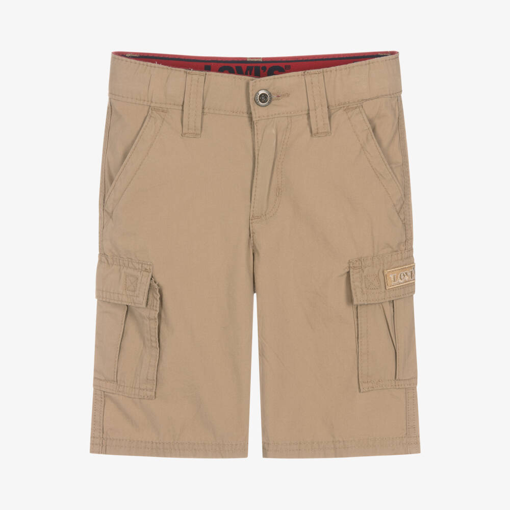 Beige relaxed fit, cargo shorts for boys by American brand Levi's. Made from a lightweight cotton twill, these shorts have two convenient front slant pockets with velcro fastening side pockets. They fasten with a gold zip and logo embossed button. They also have an adjustable waist to ensure a comfortable fit. The brand's signature detailing can be found on the Red Tab label on the back pocket and an additional tab on the side pocket.