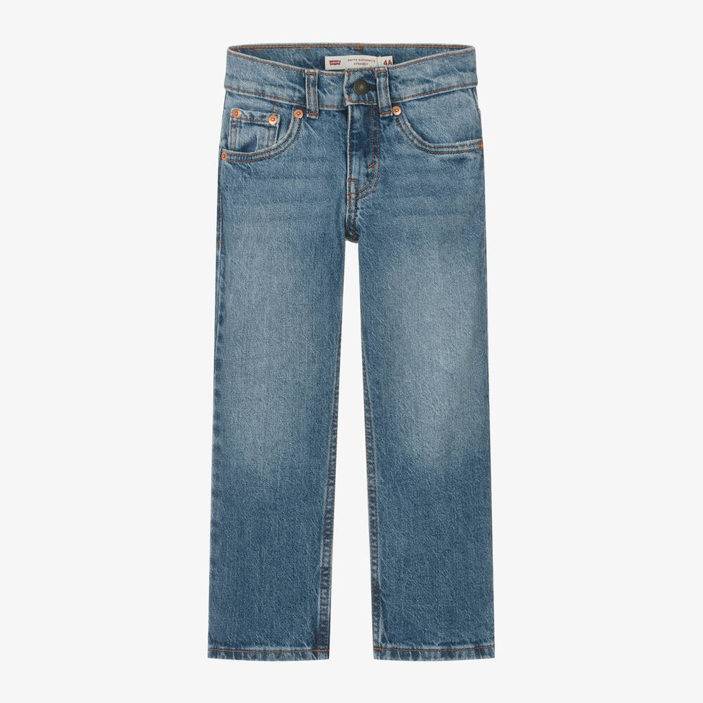 Blue 551Z jeans for boys by Levi's, designed with straight legs and a relaxed fit through the thighs. They have five-pocket styling, contrast topstitching, copper tone rivets, the iconic 2-Horse logo jacron and the signature Red Tab on the back for a classic look. Made in soft, mid-weight cotton denim, they fasten with a hook and zip and have an adjustable waist for a good fit.