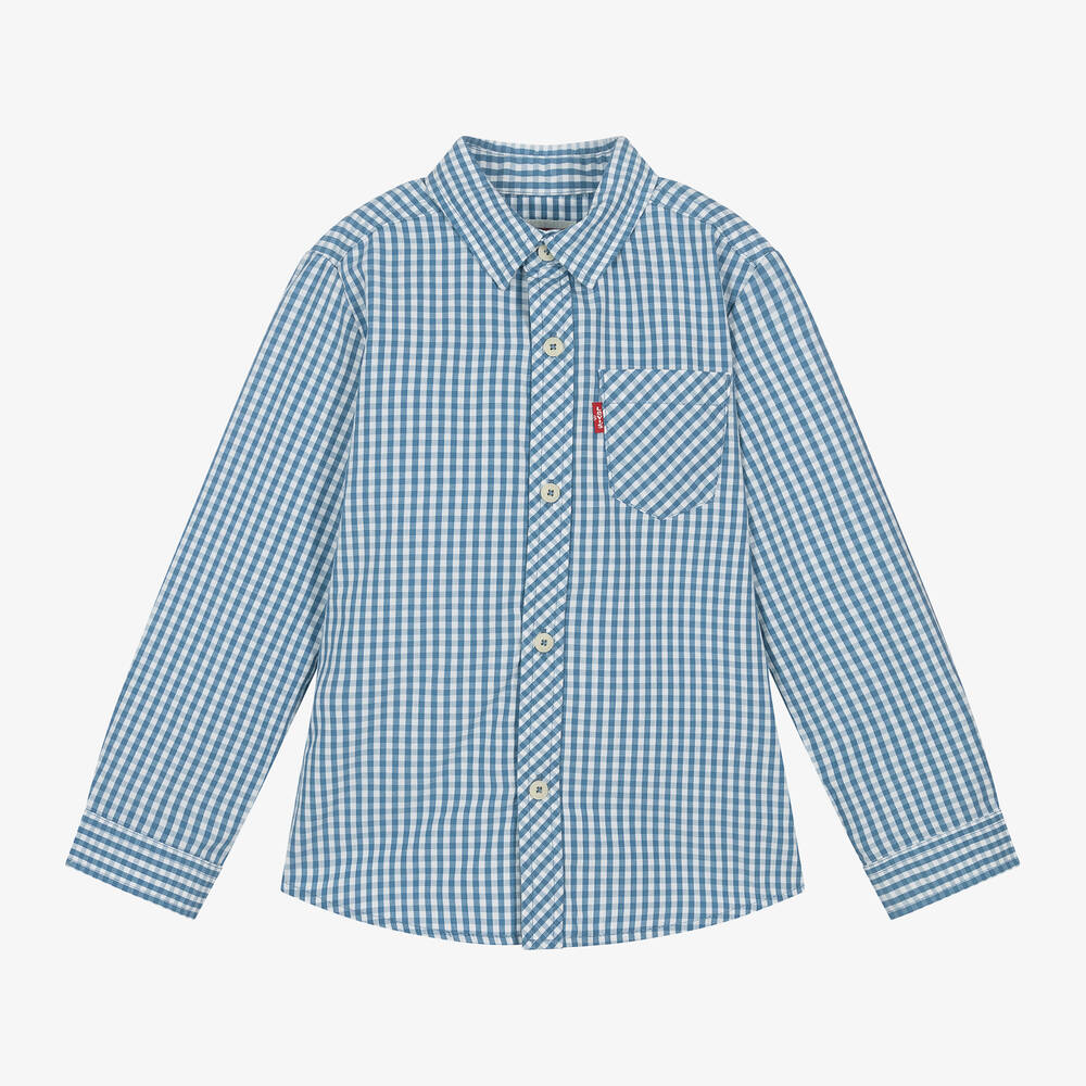 A blue and white check long-sleeved check shirt for boys by Levi's, made from a soft and lightweight cotton blend. Fastening with ivory buttons on the front and on the cuffs, it has a smart pointed collar and an iconic Red Tab stitched to the chest pocket.