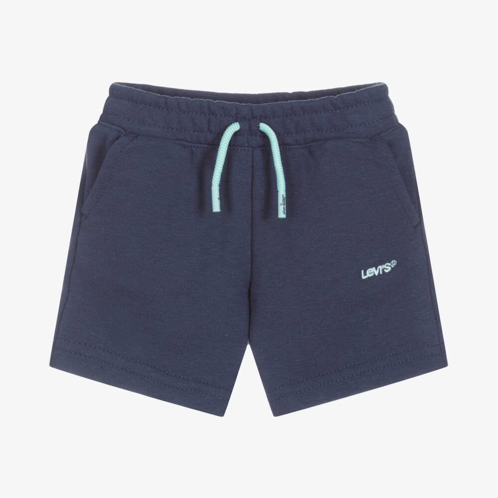 Navy blue cotton shorts for little boys by iconic American brand Levi's. Ideal for casual, relaxed days, they are made in comfortable jersey with an elasticated waistband. With a faux drawstring and an embroidered logo on one leg in turquoise blue, they have useful jetted front pockets and a patch pocket around the back.