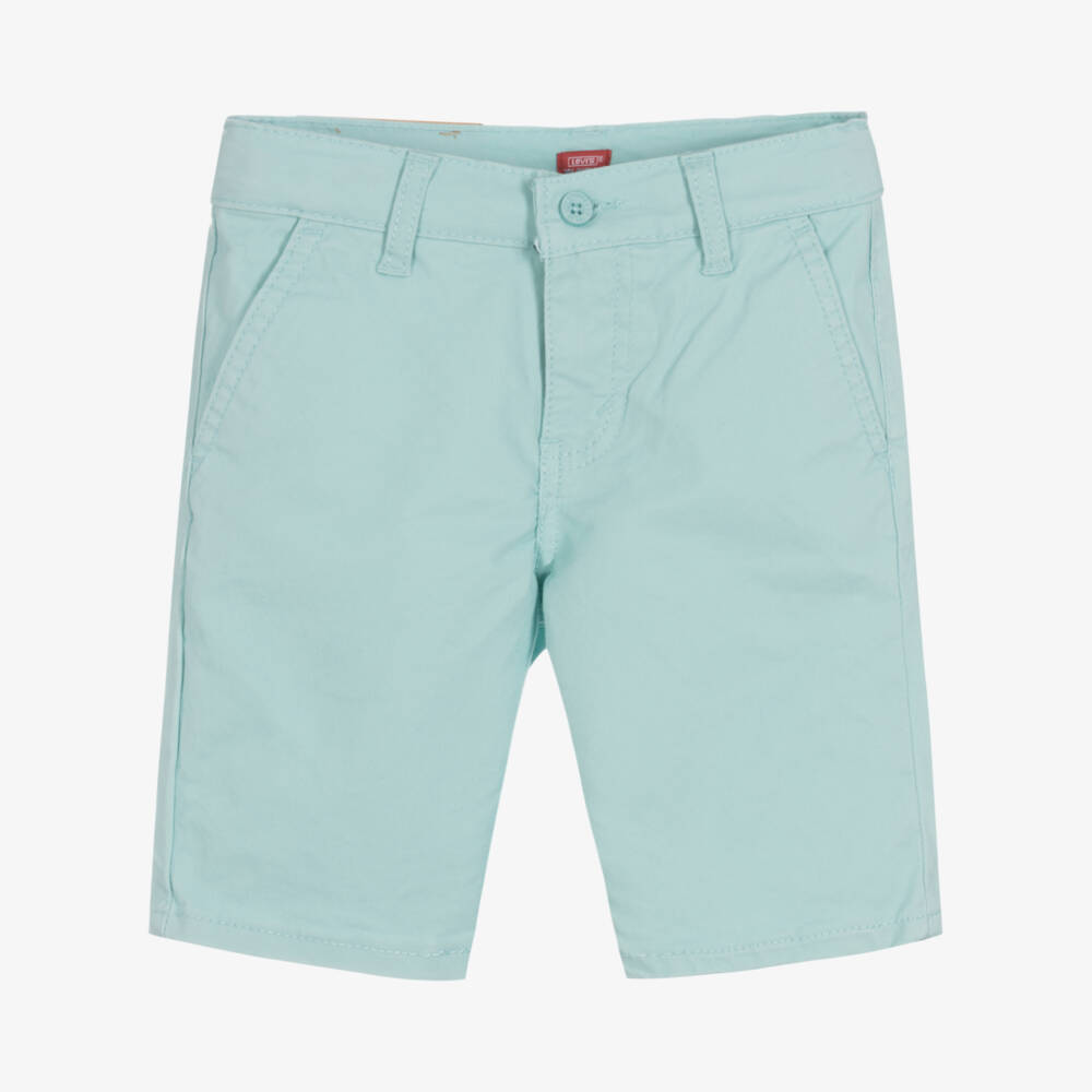 Light blue cotton chino shorts for boys by American brand Levi's, with a straight cut. Made in lightweight, comfortable twill, they fasten with a front logo button and zip, with an adjustable waistband for a good fit. They have jetted front pockets, back pockets and useful belt loops on the waist.