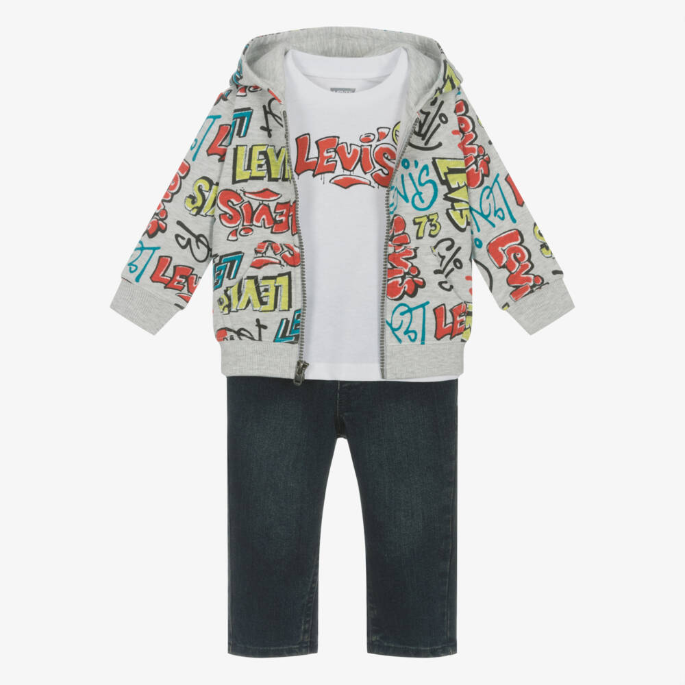 Cool and casual for little boys, a three-piece outfit set from Levi's. The grey marl zip-up hoodie is made in comfortable cotton blend jersey with a cosy fleece feel inside. It has a bold graffiti-style pattern in red, green and blue, with ribbed trims and a front pouch pocket. The white jersey T-shirt has a matching graffiti logo print. Completing the set is a pair of dark blue denim jeans with an elasticated waist, faux front pockets and patch pockets on the back. All three pieces are detailed with the brand's red tab logo for a signature touch.