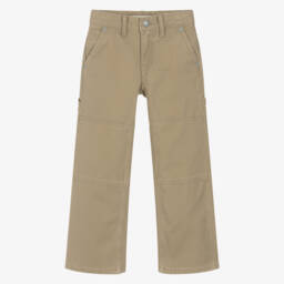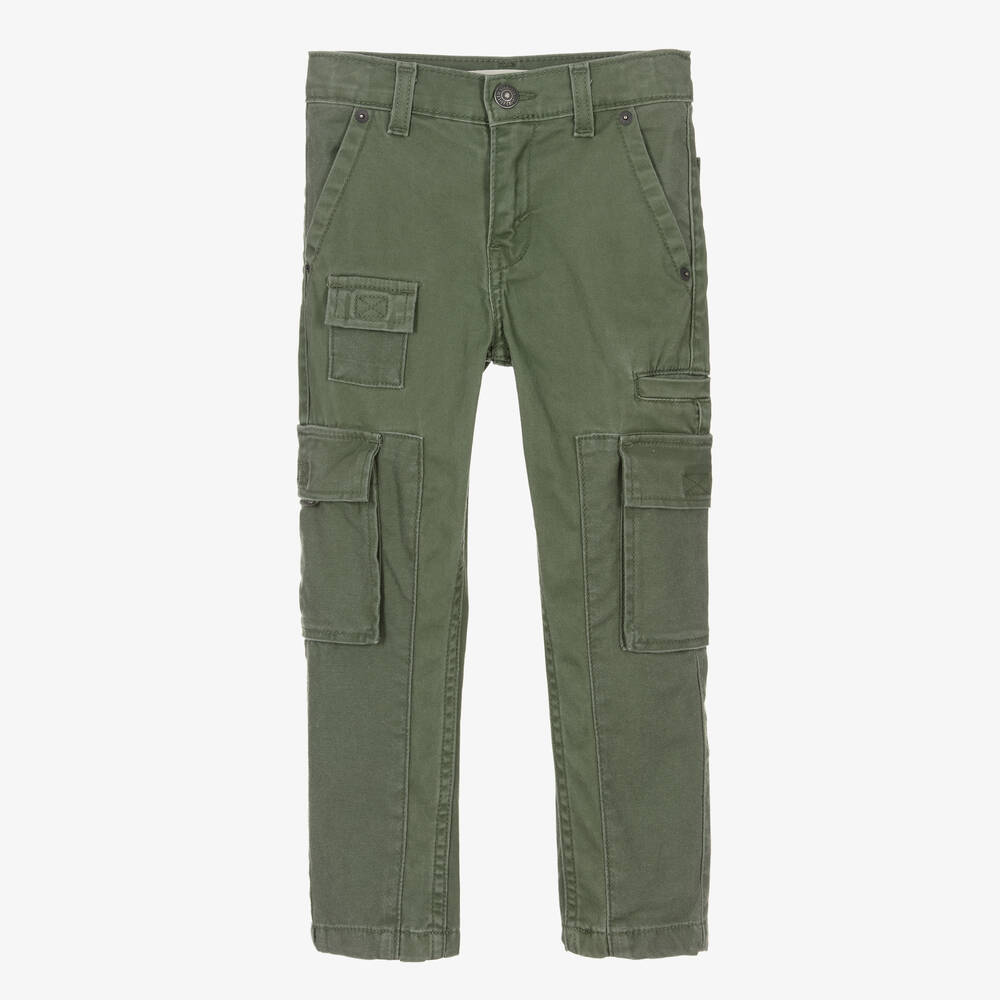Khaki green cargo trousers for boys by Levi's, in a regular tapered fit. Made in soft cotton twill, they have useful front and back pockets, including velcro-fastening flap pockets. There is an adjustable waist for an ideal fit, fastening with a zip and hook on the smaller sizes, and a zip and button on the bigger sizes. A branded label on the back adds a designer finish.