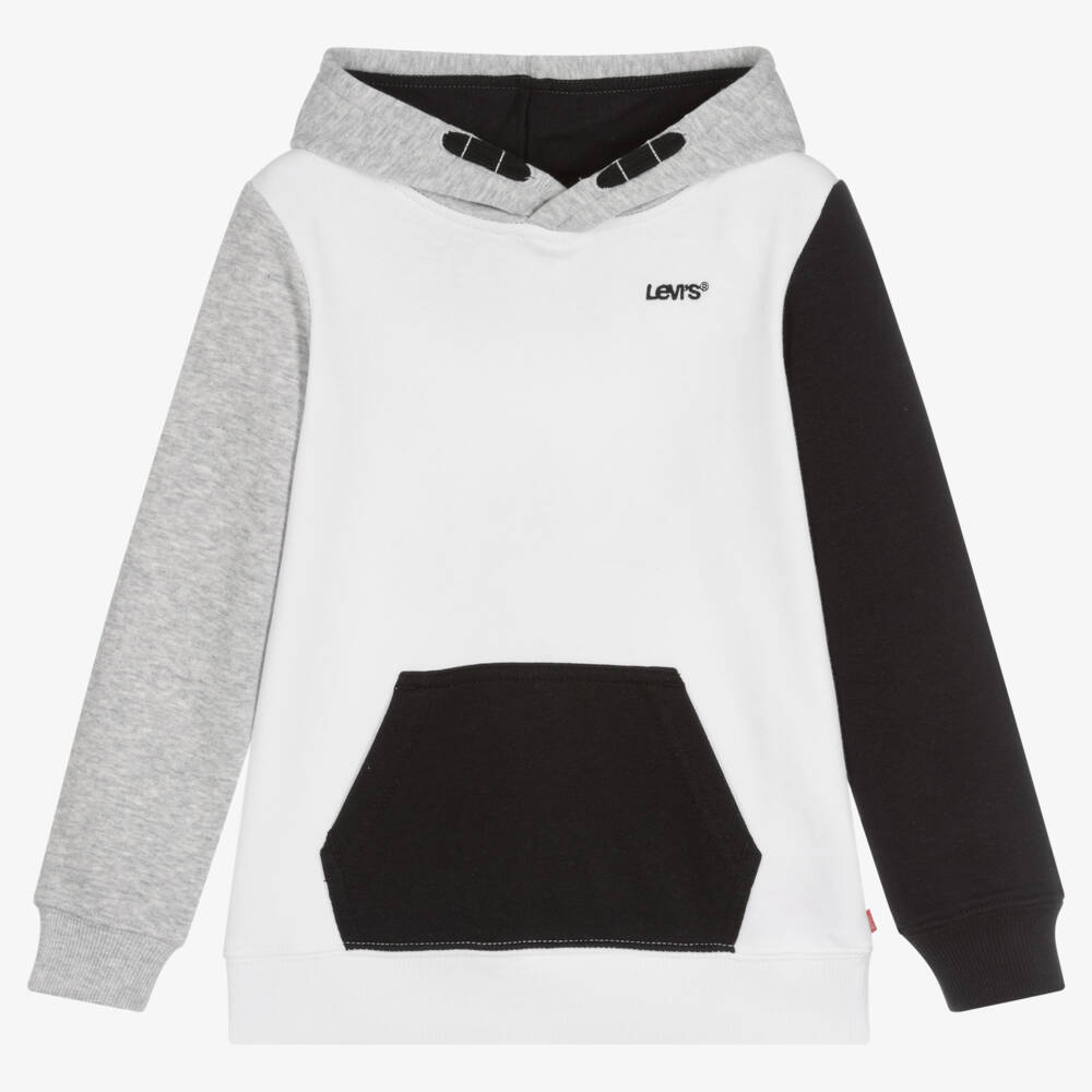 White, black and grey marl colour block hoodie for boys by iconic American brand Levi's. Just right for casual, relaxed days, it is made in soft, comfortable, cotton-blend jersey, with an embroidered black logo on one side. It has a faux drawstring on the hood, neat, ribbed trims and a useful pouch pocket on the front. The instantly recognisable Red Tab logo is sewn on one side seam.