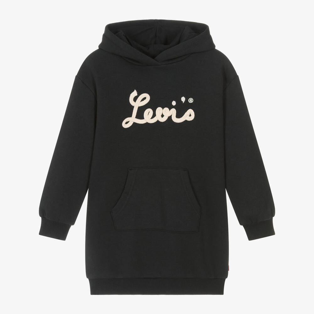 Girls black hooded sweatshirt dress by Levi's, made in comfortable cotton jersey, with a soft, fleecy inside. An easy-to-wear casual style, it has stretchy ribbed cuffs and hem and a pouch pocket on the front. For a distinctive designer look, the brand's logo can be seen on the front, formed from woven ivory rope and the signature Red Tab is sewn on one side seam.