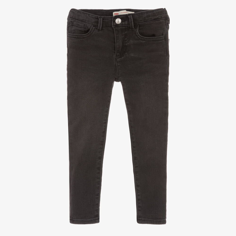 Black washed jeans for girls by Levi's, in the super skinny 710 style. Featuring an adjustable waist for comfort, they have classic five-pocket styling and an original Levi's logo badge on the back of the waist. They fasten with a shiny silver zip and metal clasp and have a shiny silver logo embossed button for a logo-inspired finishing touch.