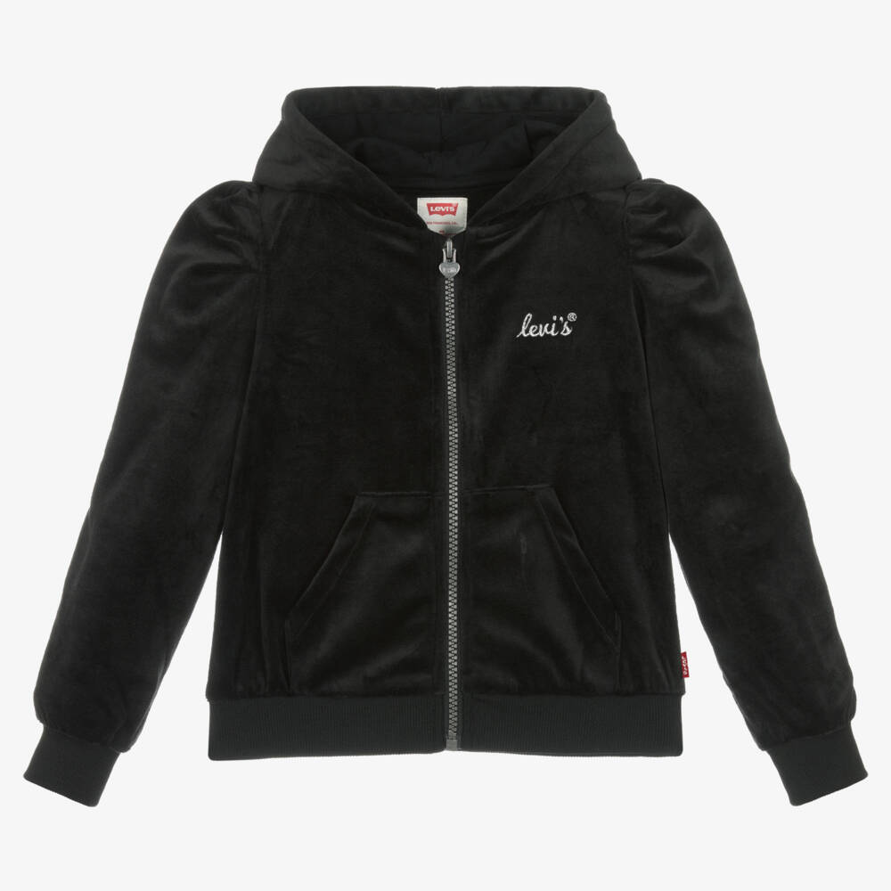 Black hooded zip-up top for girls by Levi's, made in super soft velour. Ideal for layering, it has front pockets and pretty puffed sleeves. There are cosy ribbed trims and a sparkly silver embroidered logo on the chest. It fastens with a zip on the front with a heart-shaped branded pull and the brand's signature Red Tab logo is on the side for a distinctive designer finish.