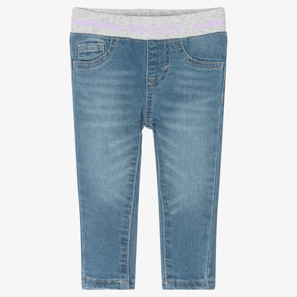 Blue-wash skinny jeans for little girls by Levi's, made from cotton denim with a slight stretch. Easy to pull on, these skinny jeans have a pale grey and purple ribbed elasticated waistband with a subtle logo design. The patch pockets on the back with an iconic Red Tab complete the look.
