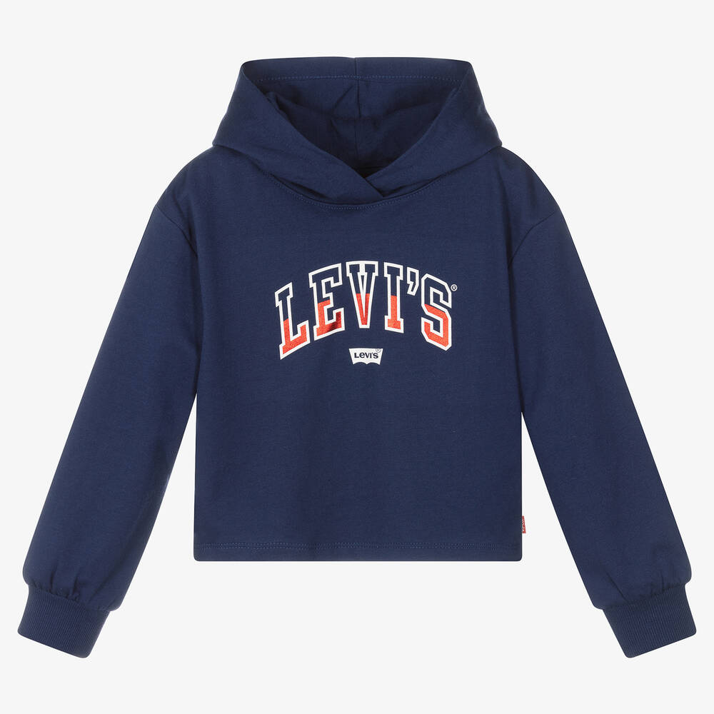 Navy blue cropped hoodie for girls by American brand Levi's, with a white and red foil logo print on the front. Made in lightweight cotton-blend sweatshirt jersey, it has full sleeves with ribbed cuffs and the signature Red Tab logo on the side seam.