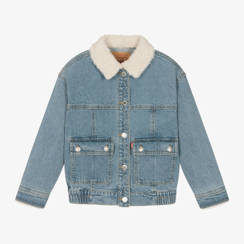 A light blue denim jacket for girls by Levi's, with an ivory sherpa fleece collar and trims. This stylish take on the classic trucker jacket has popper fastening flap pockets on the front, zig zag stitching on the placket and an elasticated hem. It fastens with branded silver button on the front and cuffs. The brand's iconic Red Tab add a classic signature touch.