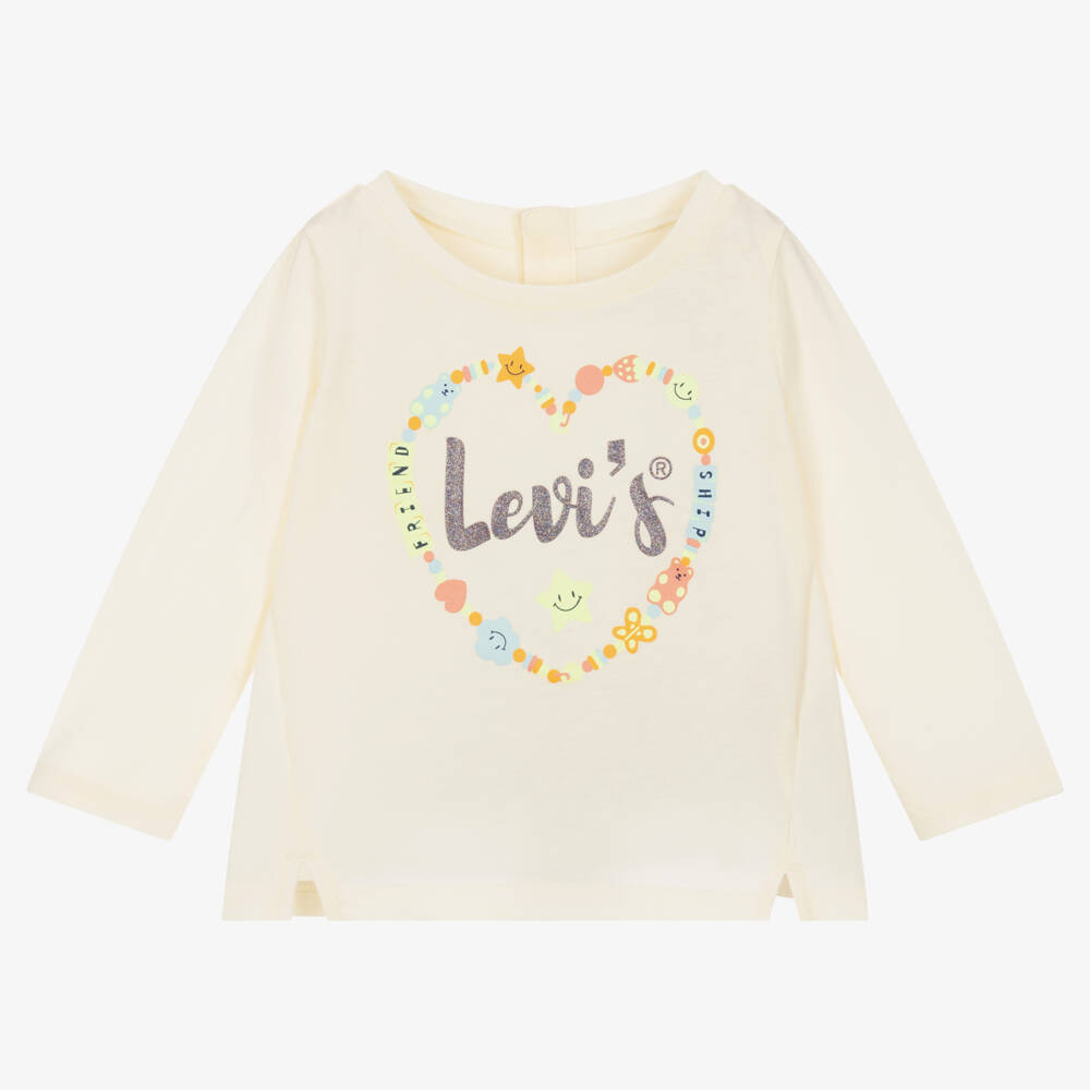 Pretty ivory long-sleeved top for little girls by Levi's, made in soft and stretchy cotton jersey. Lightweight and comfortable to wear, it has a sparkly logo printed on the front inside a cute and colourful heart-shaped friendship necklace. It has a split hem at the front and popper fastenings on the back for easy dressing.