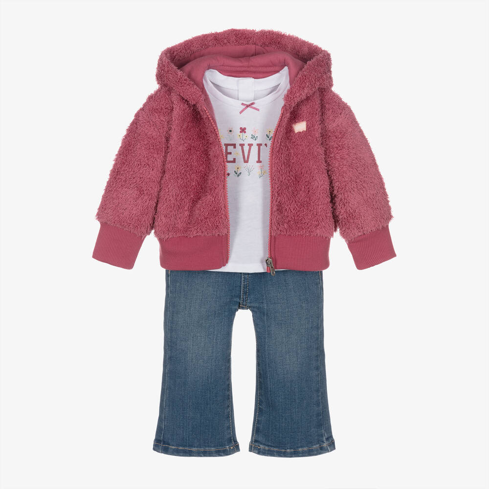 A casual trouser set for little girls, by American brand Levi's. Soft and fluffy, the pink zip-up top has a cosy hood, ribbed trims and a Batwing logo on the chest. Fastened with poppers on the back, the lightweight jersey T-shirt comes in a white colourway with a pretty floral logo design and a ribbon bow on the neckline. Completing this three-piece outfit, is a pair of stretchy denim jeans with authentic topstitching and a gently flared leg. Branded with the iconic Red Tab, they have a fully adjustable waistband and a hook fastening on the front.