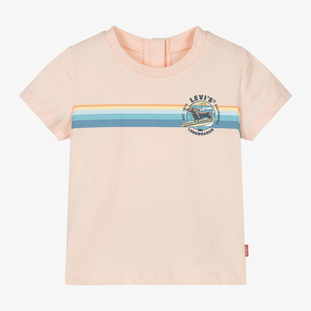 An organic cotton T-shirt for younger boys and girls by Levi's, in a light tone of orange-pink. This short-sleeved T-shirt has a blue and yellow striped print across the front, with a surfing puppy dog detail on one side for a fun Californian vibe. Soft and comfortable, it is signed with the iconic Red Tab on one side and secures with hidden poppers on smaller sizes for quick dressing.